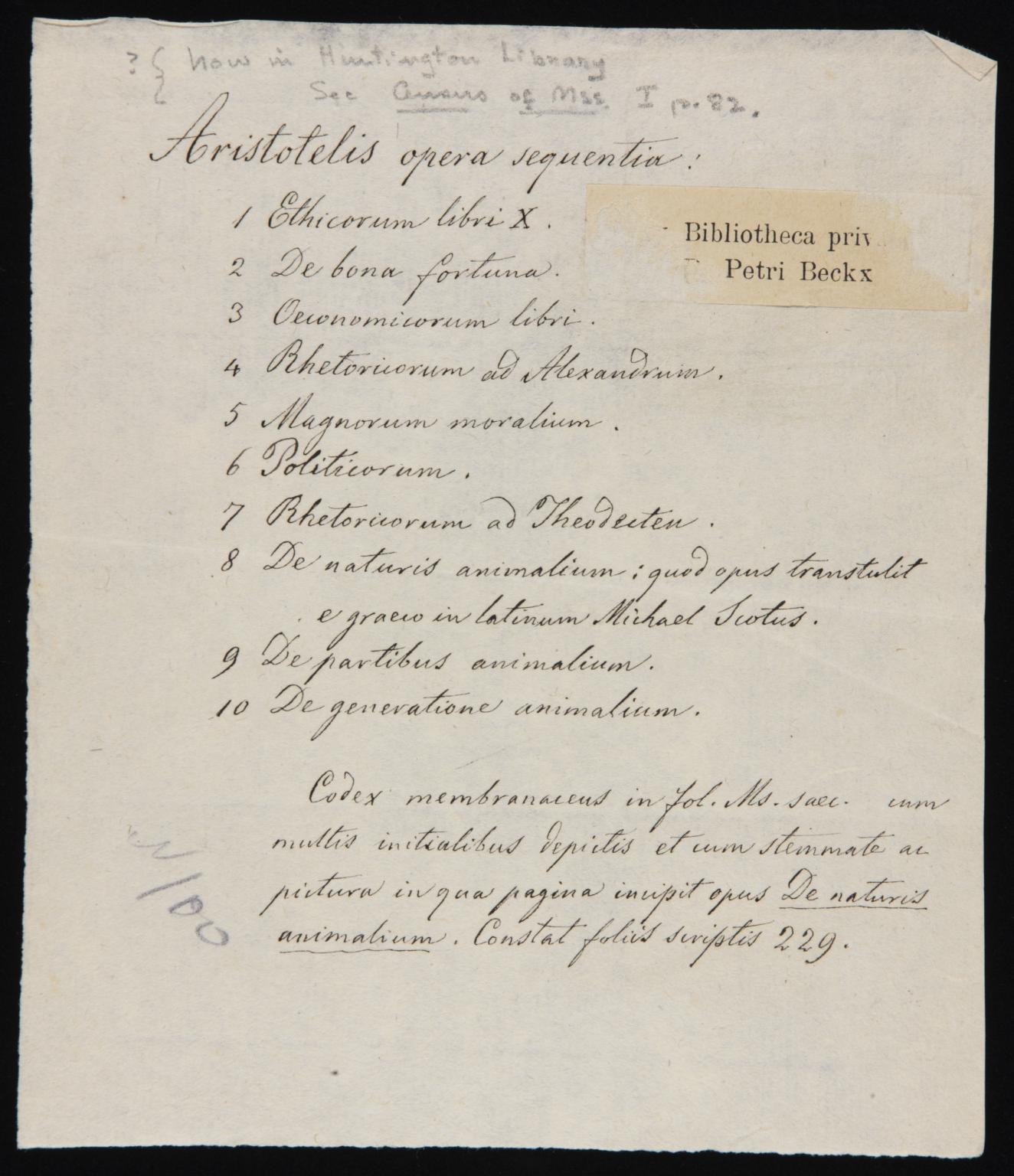 The Aristotle MS that is discussed in this page was acquired by Voynich, as demonstrated by the fact that this bibliographical slip was preserved among his papers that are now at the Beinecke Library. Looking at the above illustration, there are further annotations in pencil on this bibliographical slip. The entry near the bottom left says "N100", and is most probably an entry from Wilfrid Voynich himself, with an early inventory number (8). The other pencilled remarks in the top margin are in the hand of Miss Anne M. Nill (9), where she indicates that this manuscript was later sold to the Huntington Library in San Marino, California, making reference to De Ricci (10) p.82, where an Aristotle MS appears with shelf mark HM 1035.