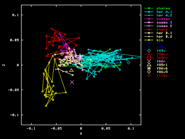 Each square dot stands for one page of the manuscript; its coordinates are derived from the relative frequencies of certain words, letters, letter groups, etc. in that page.