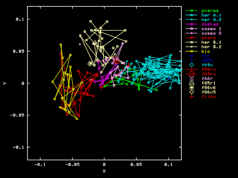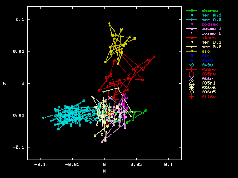 The "Pharma" projection is an attempt to discover a separation of Herbal-A pages from Pharma page, by using a different projection to three-space. The X, Y, and Z axes were obtained by orthogonalization of PHA-HEA, HEB-HEA BIO-HEA, where PHA is the vector of wordclass frequencies for the "Pharma" section. Here are the X, Y, and Z coordinates of each page in this projection.