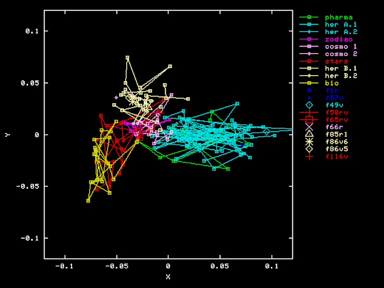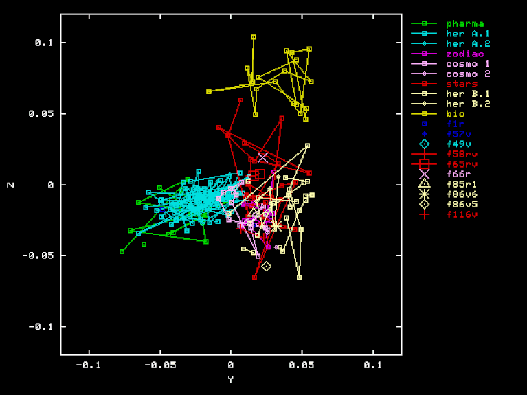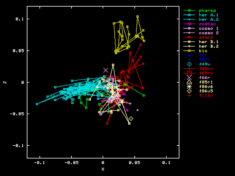 The "Pharma" projection is an attempt to discover a separation of Herbal-A pages from Pharma page, by using a different projection to three-space. The X, Y, and Z axes were obtained by orthogonalization of PHA-HEA, HEB-HEA BIO-HEA, where PHA is the vector of word frequencies for the "Pharma" section. Here are the X, Y, and Z coordinates of each page in this projection.