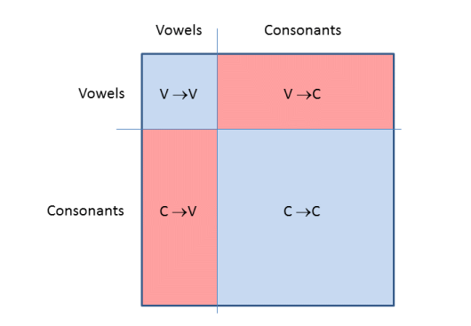 The vowels still include the space character, while the consonants have been split into two groups. The resulting A matrix is: