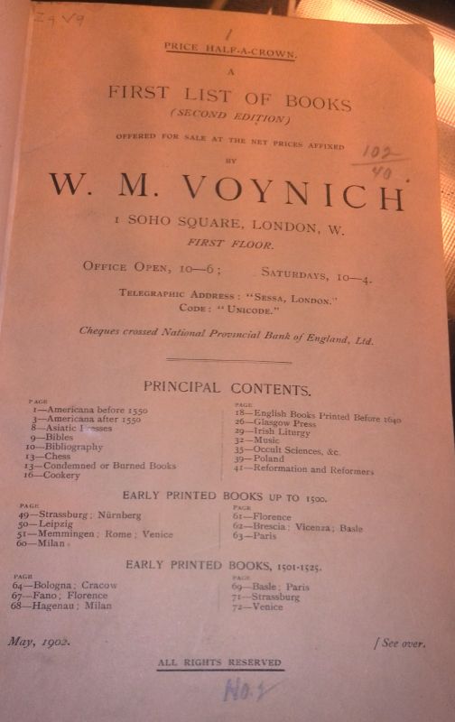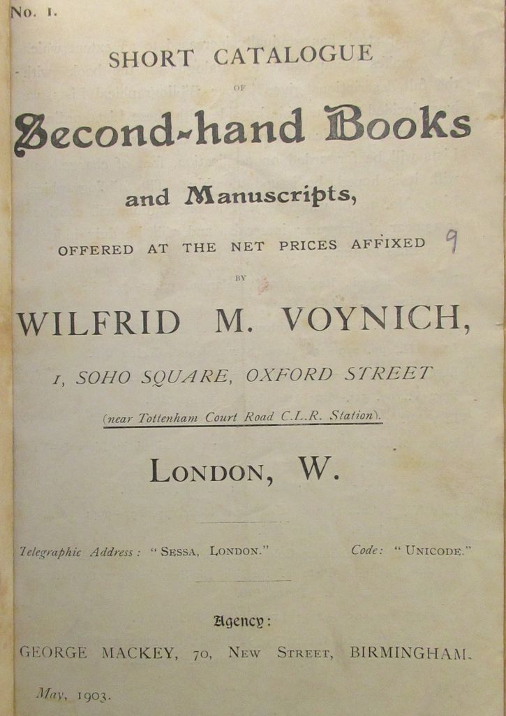 An early list of rare books was issued in May 1903, and in this he gives his name as Wilfrid M. Voynich (see image) (7).